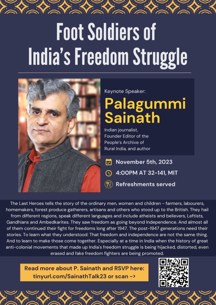 Palagummi Sainath, award-winning Indian journalist, author, and Founder Editor of People’s Archive of Rural India, will deliver a keynote address on November 5, 2023, at 4:00 PM at MIT.